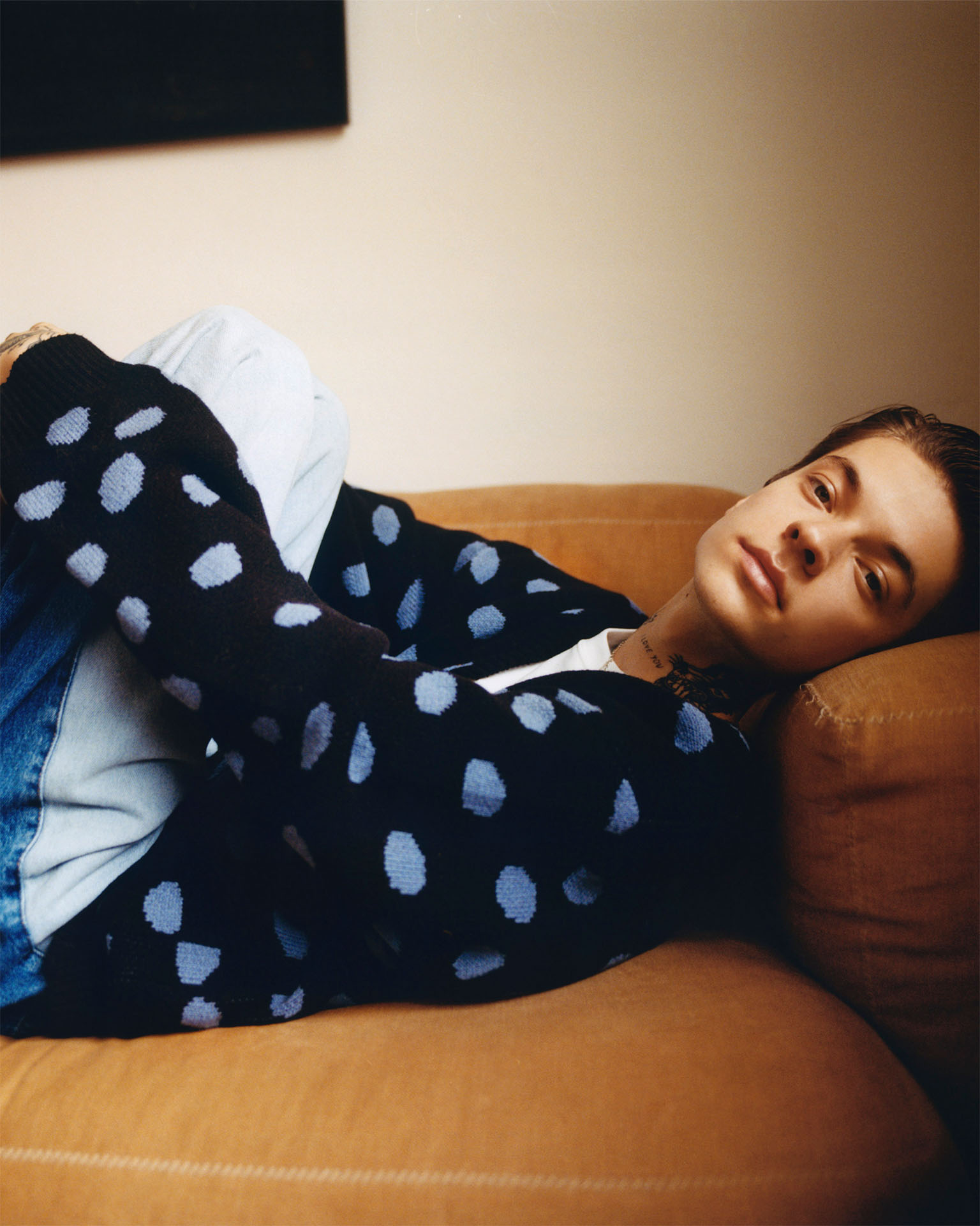 Men’s silhouettes focus on a relaxed approach to streetwear. There are patchwork solutions (denim trousers and jacket), vintage inspirations (knitted waistcoat with wavy pattern, jumper with wide stripes), as well as broken classics (checked trench coat). The colours of the collection are slightly subdued; browns, greys and blacks are accompanied by smoky pink, denim blue, and graphic accents in the form of a spotted pattern on the cardigan. There is also a nod to the artsy painting trend with a jumper with sunflowers print.