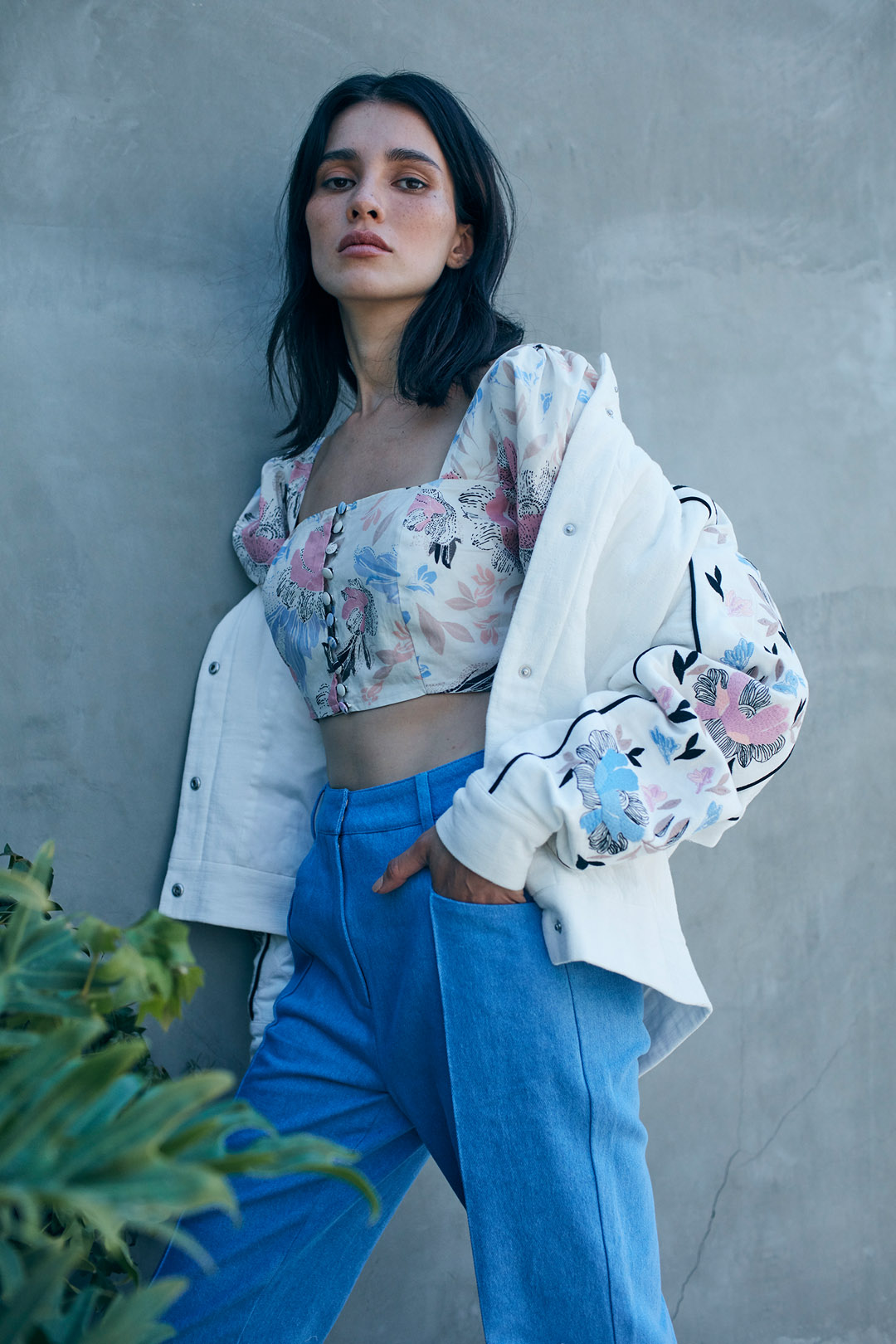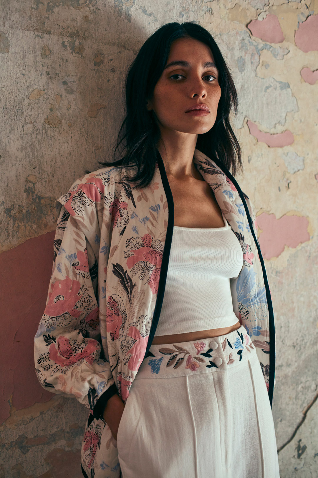 Each item in this collection is unique. The dress and the light quilted jacket are decorated with original print which resembles a watercolour artwork rather than a modern digital print. Various embroidery techniques have also been used: flat embroidery in a folk style on white trousers or quilted bomber jacket, and English embroidery on a black dress with a frill. Raw organic cotton and denim are accompanied by fabrics with a creased, waffled texture, such as soft muslin (also made from organic cotton) and thicker or thinner knits. The artistry of the collection is emphasised by contrasting, decorative laces on the jumpers and a colour palette that is pleasing to the eye, almost painterly. Saturated denim blue, floral pink, vanilla yellow and off white colours correspond to the pattern on the dress, kimono jacket and short top with puffs. A special feature of the collection is a black top with white binding; handmade crochet design in a limited number of pieces.