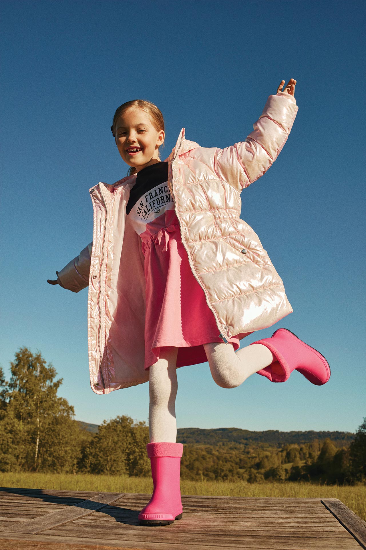 Inspiracją do powstania kolekcji był wrześniowy powrót do szkoły. W rezultacie powstał szereg propozycji, które wpiszą się w różne dziecięce gusta i sprawdzą się na wiele okazji. Widać to choćby po dziewczęcej odsłonie kolekcji, w której znalazły się nie tylko dżinsy, praktyczne komplety z legginsami i dresowe sukienki, ale też plisowane spódnice i odświętne bluzki. Nie brakuje jesiennych klasyków, takich jak kalosze i kurtki w różnych fasonach, ani wygodnych sneakersów i plecaków. Kolekcję dopełniają czapki w modnych kolorach i praktyczne dodatki: nerki, torby, a nawet akcesoria do włosów.