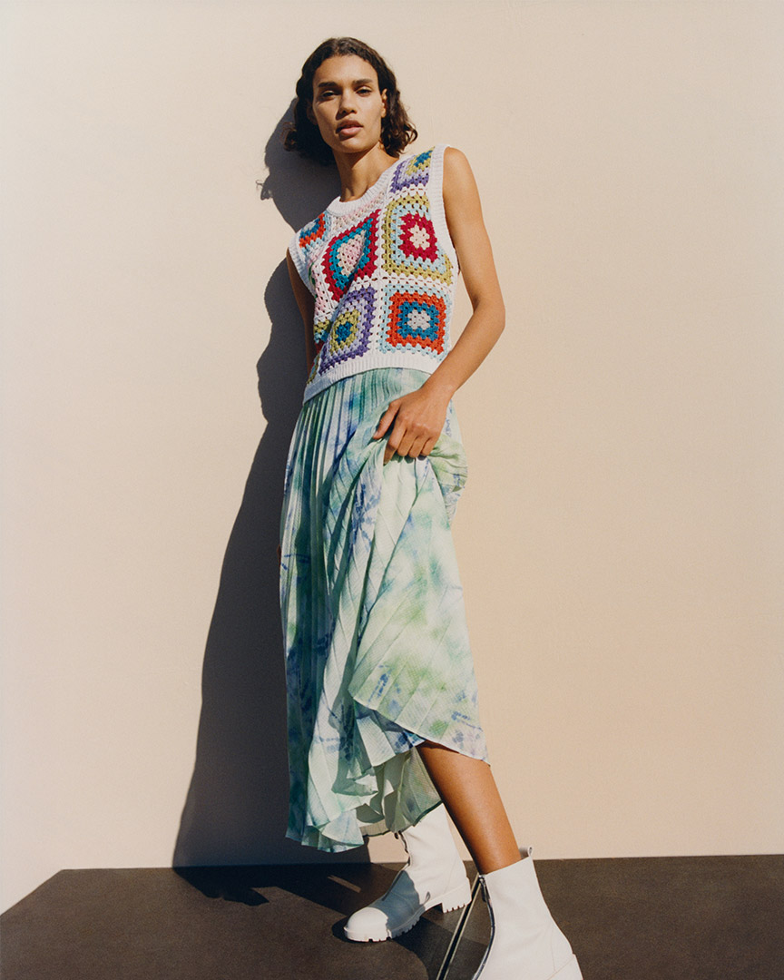 Wiosna w Reserved to śmiałe połączenie pasteli z wyrazistymi nadrukami, w tym dużymi graficznymi kwiatami, tie dye lub czarno-białą pepitką. To także ciekawe ujęcie romantycznego stylu, z przeskalowanym kołnierzykiem zdobionym haftem lub małą falbanką, uroczymi sukienkami z bufkami czy marszczonymi topami. Pośród tego – nowy minimalizm. Skromne, oszczędne formy, wyrażone nietypowymi proporcjami i charakterystycznymi kolorami (takimi jak pistacjowy, oliwkowy, pomarańczowy czy waniliowy), pikowane, plisowane, uzupełnione kontrastującymi guzikami. Wciąż dobrze trzymają się komplety, dalekie jednak od garsonek czy garniturów w standardowym ujęciu: sukienka łączy się z kurtką typu shacket w tym samym różowym kolorze, a krótki pudełkowy żakiet – z mini spódniczką. Całości towarzyszą nowoczesne akcesoria: pikowane pantofle, sandały japonki na obcasie, jasne botki i kozaki na traperskiej podeszwie, pikowane lub marszczone torebki kopertówki lub na krótkiej rączce. I ogromne, przypominające gogle okulary przeciwsłoneczne – ukłon w stronę lat osiemdziesiątych.