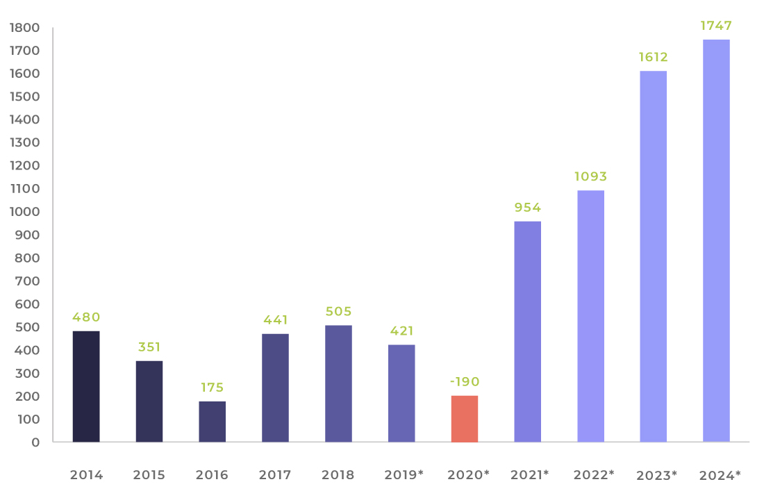 Rozwój powierzchni sklepów LPP w tys. m2 (2014-2024)